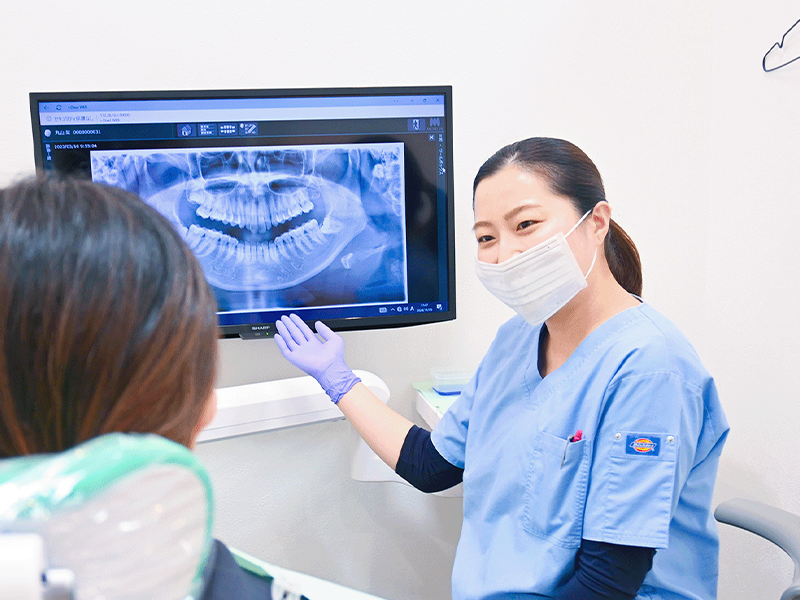 治療時はできるだけ視覚的にわかりやすい説明を大切にしています。お口の中を撮影した写真やレントゲン写真を実際に見ていただきながら、どこが悪いのか、どんな治療をしていくのかを細かくお伝えします。